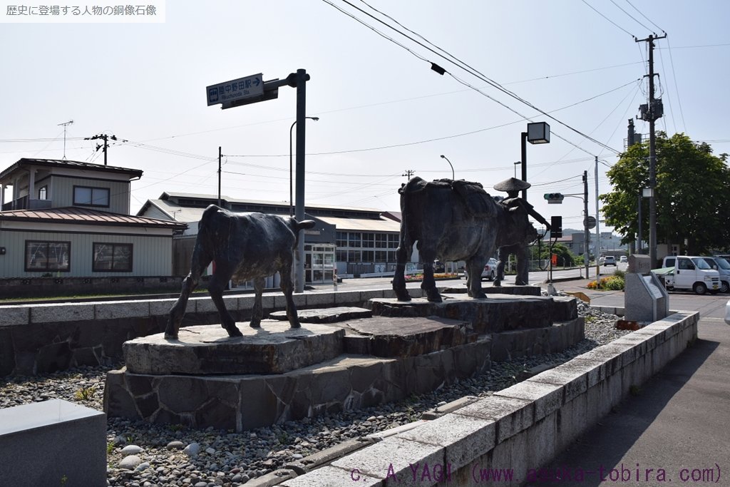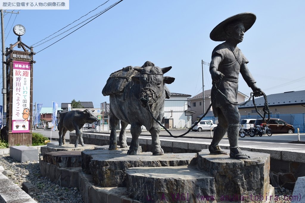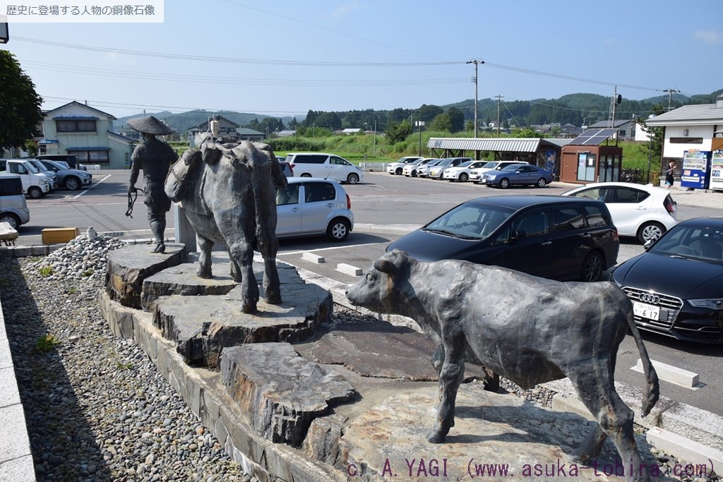 野田浜で作られた塩は「牛方」とよばれる人たちによって牛の背に乗せて細い山道を山間部まで運びました。塩を運ぶために何度も往来する道は踏み固められて「塩の道」となりました。