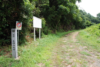 | 山道終点の手前に南水門への案内標示を見つけることができます。しかし,ここは水門としての形をとどめておらず,小規模な石積があるだけです。 今回の訪問は何の下調べもなく出かけたため,この石積を見て,これまで訪ねた他地域の神籠石と同様に,ここ「石城山神籠石」はこのような石積が残っているだけの史跡かと推測してしまいました。 しかし,実際は大規模な石積や水門跡を見ることができる山城で,短時間で回れるものではないことがわかりました。。 |