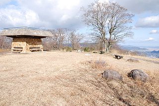 | 頂上には駐車場やトイレが整備されています。そこから,展望台のあるところまで上ります。すると,瀬戸内海,大橋,讃岐富士,府中湖や多くのため池,広大な讃岐平野を見下ろすことができます。天気のよい日は,爽快な気分になる素晴らしい場所です。展望台下の平らな部分に礎石らしき石が転がっています。この辺りに建物が造られていたのだろうと推測されます。 |