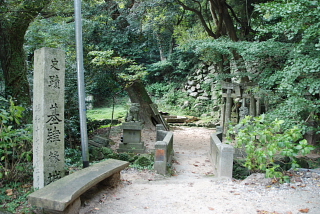 この石城山は幕末の動乱期の史跡でもあります。当時長州(中国地方西部)では高杉晋作が奇兵隊という戦闘部隊を結成し幕府に対抗しました。1866年(慶応元年)6月,第二次長州征伐では石城山の神護寺におかれていた第二奇兵隊の本陣から出陣し,幕府軍を相手に戦って大島の奪還に成功しています。1867年の大政奉還後は官軍として旧幕府軍と戦いました。現在神護寺はなく,第二奇兵隊本陣跡の石碑が石城神社の境内地に建てられています。 本陣跡を通り西水門へ向かいます。 |