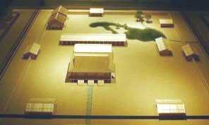 672年5月,美濃に出かけていた大海人皇子舎人の一人(物部雄君(もののべのおきみ,別名 朴井雄君えのいのおきみ)が「先帝(天智天皇)の陵(みささぎ-墓)を造ると言いながら,美濃(岐阜県)や尾張(愛知県)の農民に武器を持たせている」と吉野へ報告に来た。物部雄君は出身地である美濃へ私用で行っていてこの情報を入手したため,急いで吉野へもどって報告した。また,大津京から飛鳥にかけて朝廷の見張りが置かれ,さらに,宇治橋で吉野への食料を運ぶ道を閉ざそうとする動きも伝わってきた。そして,大友皇子の后となっていた十市皇女からも朝廷の動きを伝えてきた。いよいよ自分の身に危険が迫っており,決断の時と考え,吉野を出て戦うことを決意した。 | ![]() 吉野の宮模型 (吉野歴史資料館許可) |